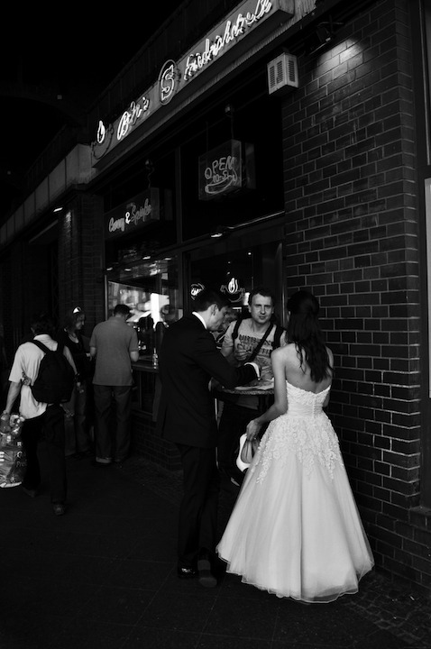 PS: да, это действительно невеста, стоящая босиком под мостом на Фридрихстрассе, в руках туфли, жуёт сосиску; вот такие реалии.